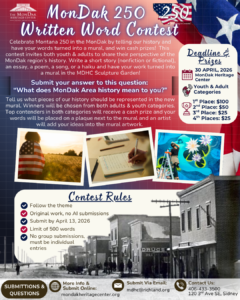 Submit Entries Here Celebrate Montana 250 in the MonDak by telling our history and have your words turned into a mural, and win cash prizes! This contest invites both youth & adults to share their perspective of the MonDak region’s history. Write a short story (nonfiction or fictional), an essay, a poem, a song, or a haiku and have your work turned into a mural in the MDHC Sculpture Garden! Submit your answer to this question:“ What does MonDak Area…